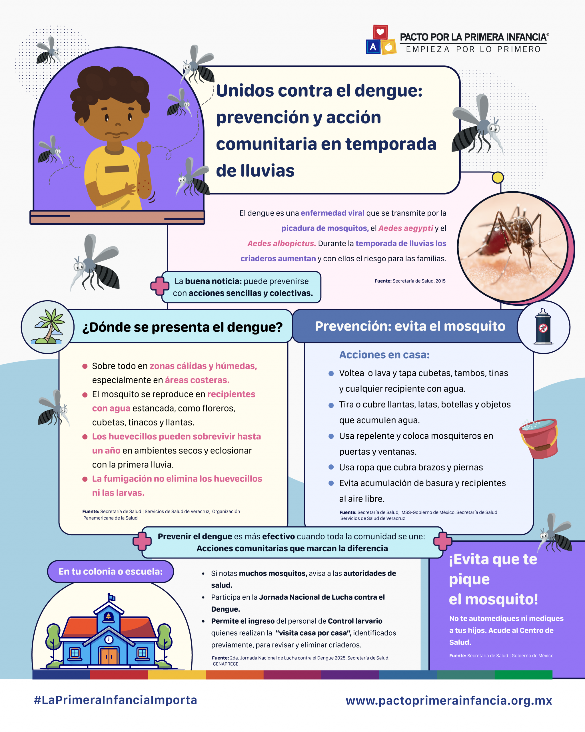 En temporada de lluvias aumenta el riesgo de dengue, ya que los mosquitos Aedes aegypti y Aedes albopictus encuentran más lugares para reproducirse y elevar el riesgo para niñas, niños y sus familias (Secretaría de Salud, 2015). En zonas cálidas y húmedas, especialmente en áreas costeras, los huevecillos pueden sobrevivir hasta un año y eclosionar con la primera lluvia (Secretaría de Salud, Servicios de Salud de Veracruz; Organización Panamericana de la Salud).